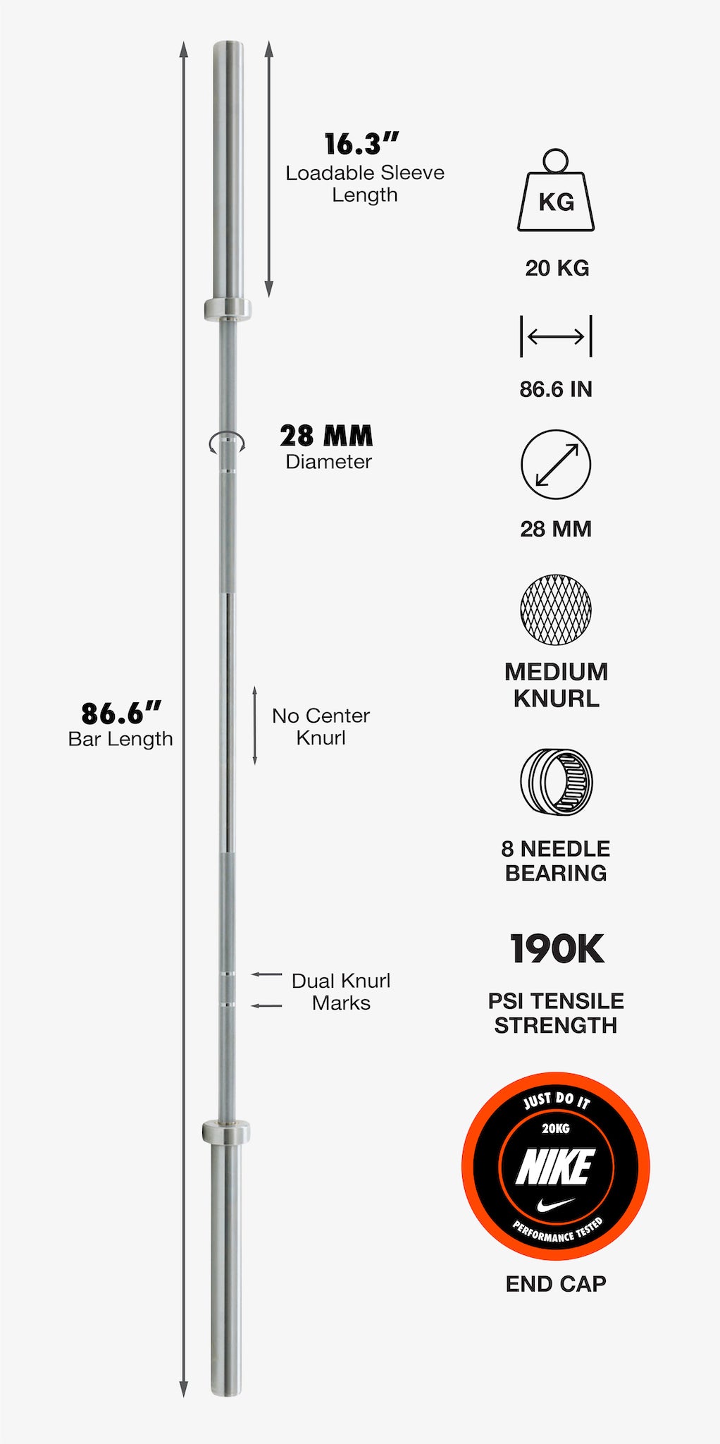Elevate your strength game with the Nike Barbell your all-in-one solution for HIIT, Olympic lifts, and functional training. With a 28mm shaft and a robust chrome finish, this barbell will stand the test of time. A medium volcano knurl with dual knurl marks and no center knurl make this barbell perfect for all occasions. Smooth rotation for all lifts supported by 8 durable needle bearings. Unleash your full potential with the Nike Barbell - where durability meets precision. JUST DO IT.