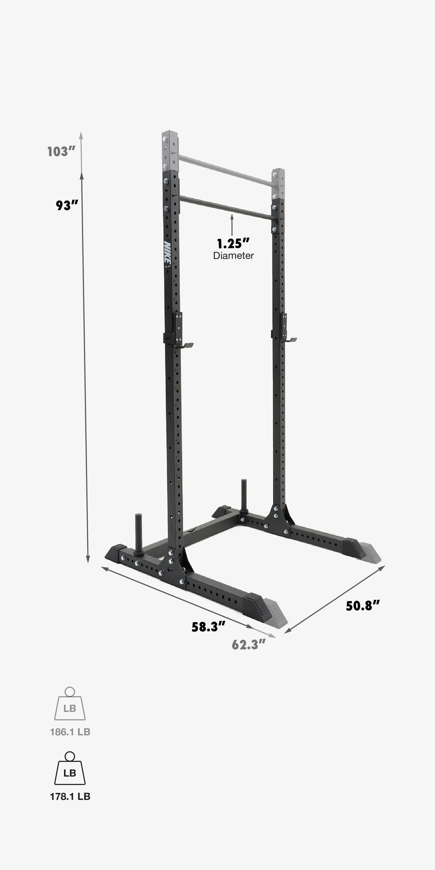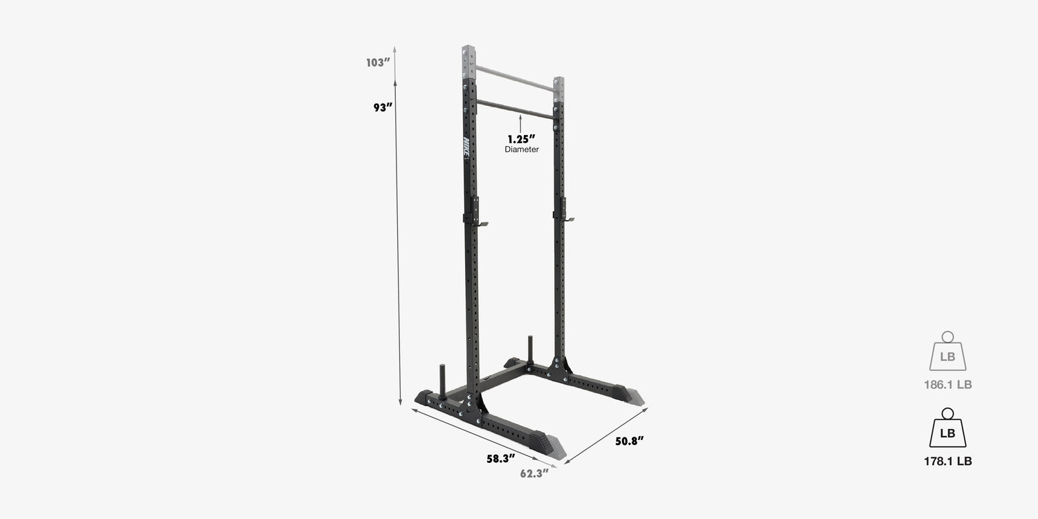 Includes two vertical uprights, 1.25" diameter pull-up bar, J-cups, and rear weight storage