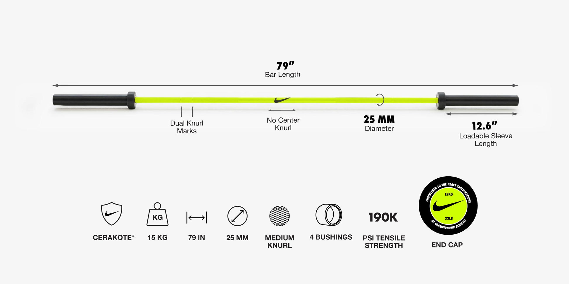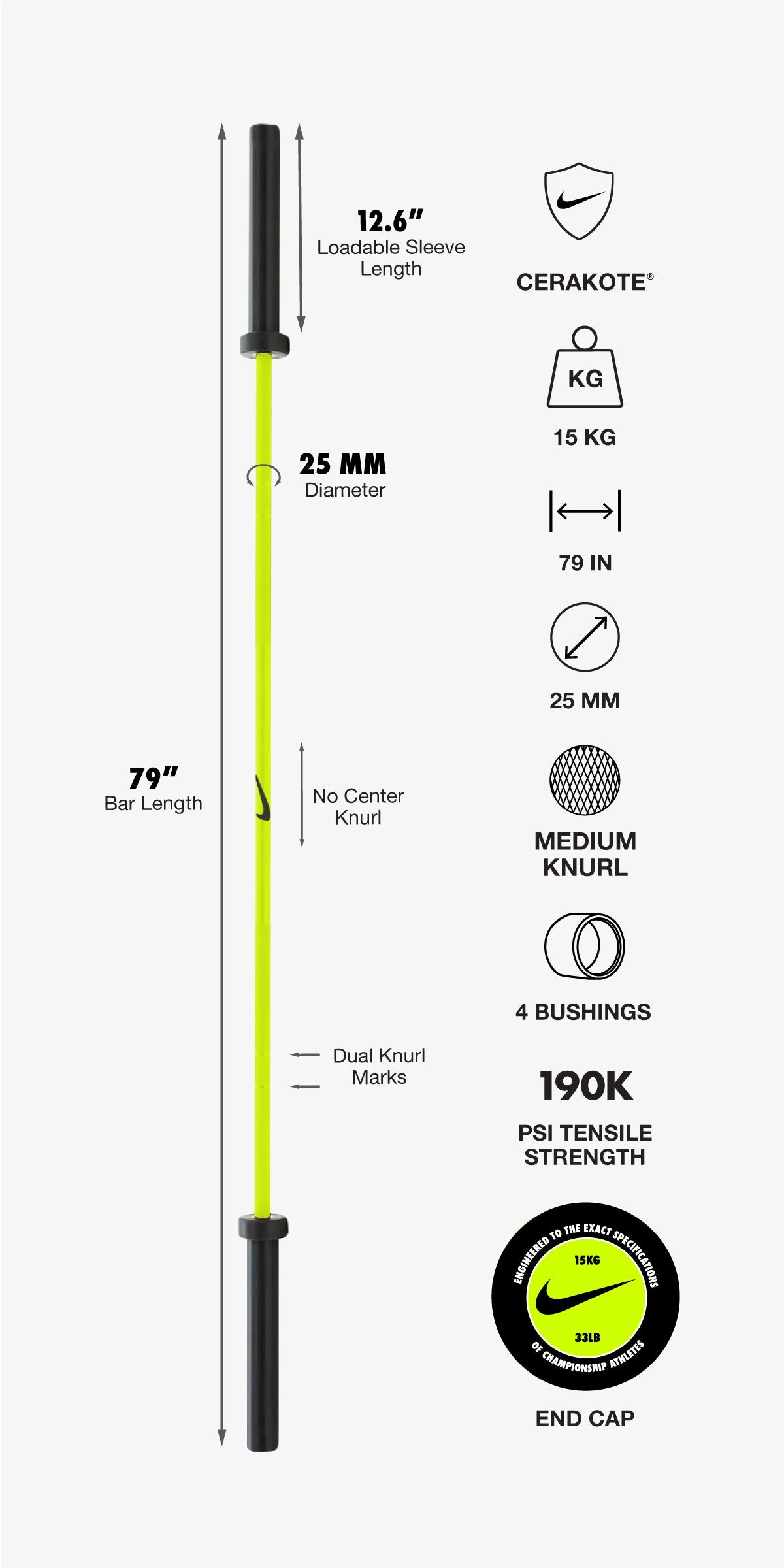 Nike Strength Shield Barbells feature a durable Cerakote® finish that protects against corrosion, wear, and tear. This industry-leading coating shields your barbell from scratches, fading, and rust, even in the toughest gym environments.