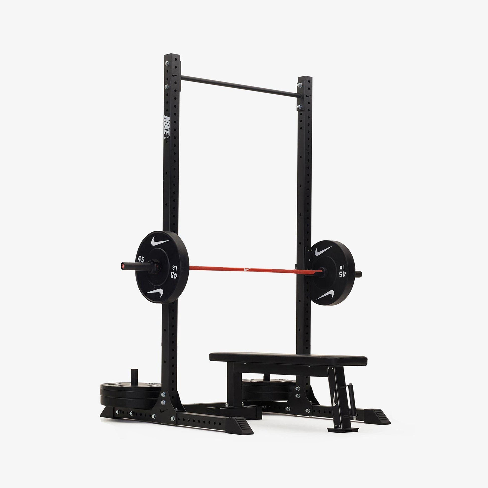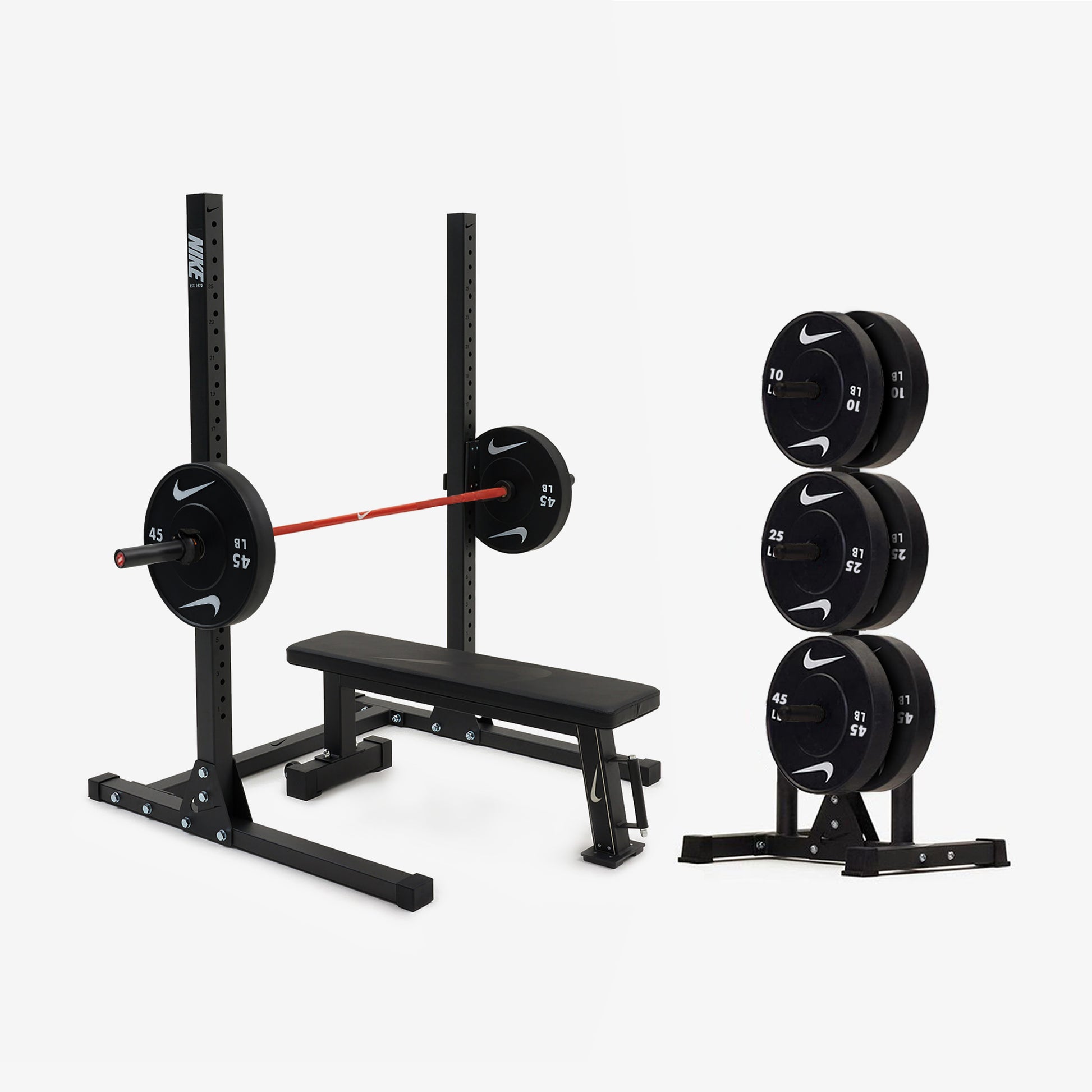 Built for heavy lifting in any space, this setup features your choice of rock solid rack, cage, or stand. Choose your from our Nike Strength Shield or Nike 1972 Power Bar, and load it with 250 lb of Nike Grind or Nike Black Rubber Bumper Plates. This setup also includes the Nike Rolling Weight Bench, and a pair of collars.