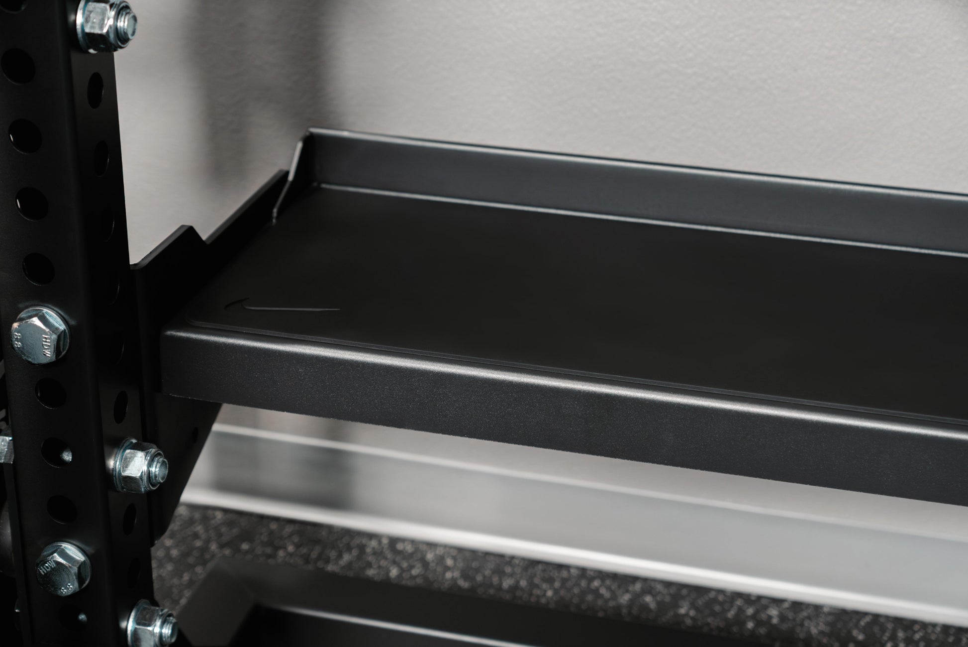 The shelf can be configured during assembly in either an angled position for dumbbell storage or a flat position for kettlebells, allowing facilities to choose the setup that best fits their training model. A folded rear lip protects equipment during use, while a custom-molded rubber mat reduces wear on both the shelf and stored gear.