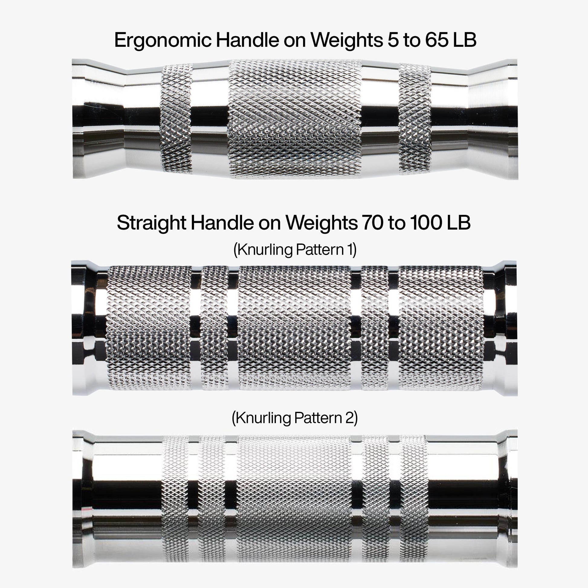 The heavier weights, 70 to 100 LB, feature a straight handle and medium knurl for improved grip and stability.