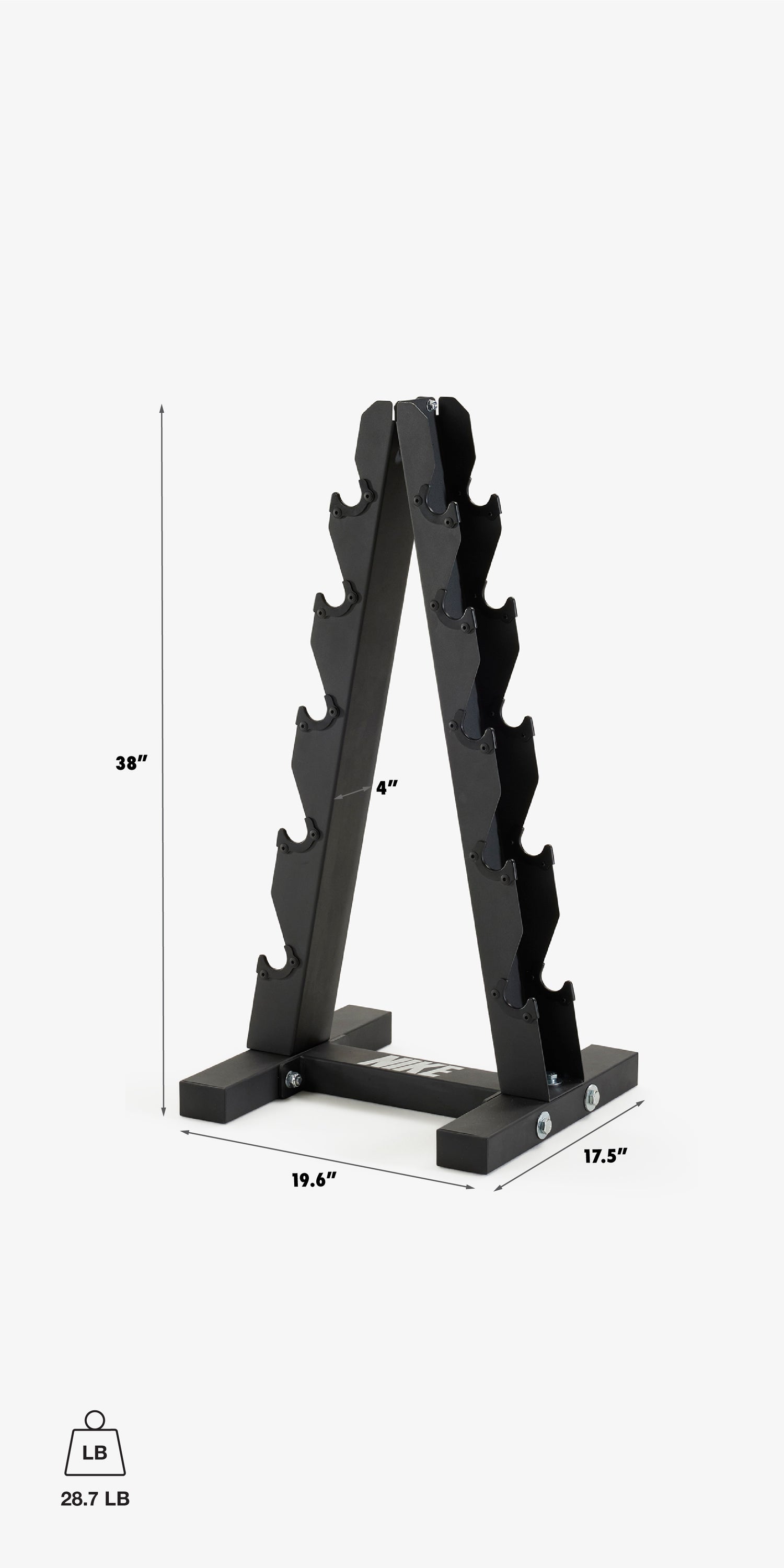 Vertically stores up to 5 pairs of dumbbells within a small footprint