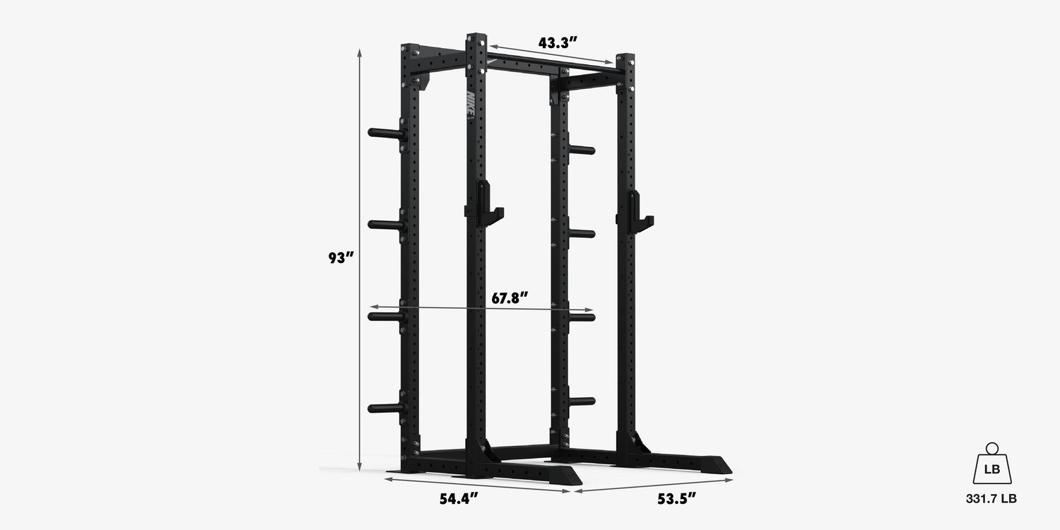 The Nike Half Rack is your all-in-one training solution, combining strength, stability, and integrated storage in a compact design. Built with 11-gauge steel and championship-level precision, its engineered for unmatched durability and performance. This versatile rack features a pull-up bar, newly designed Premium J-cups to protect your barbell, and integrated weight horns for plate storagekeeping everything within reach so you can focus on every rep.Optional shelving add-ons provide additional storage, helping you keep your space organized and ready for your next lift.