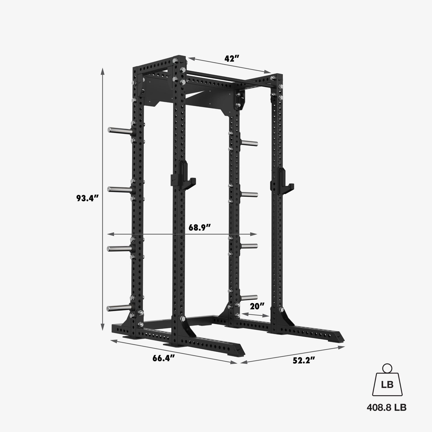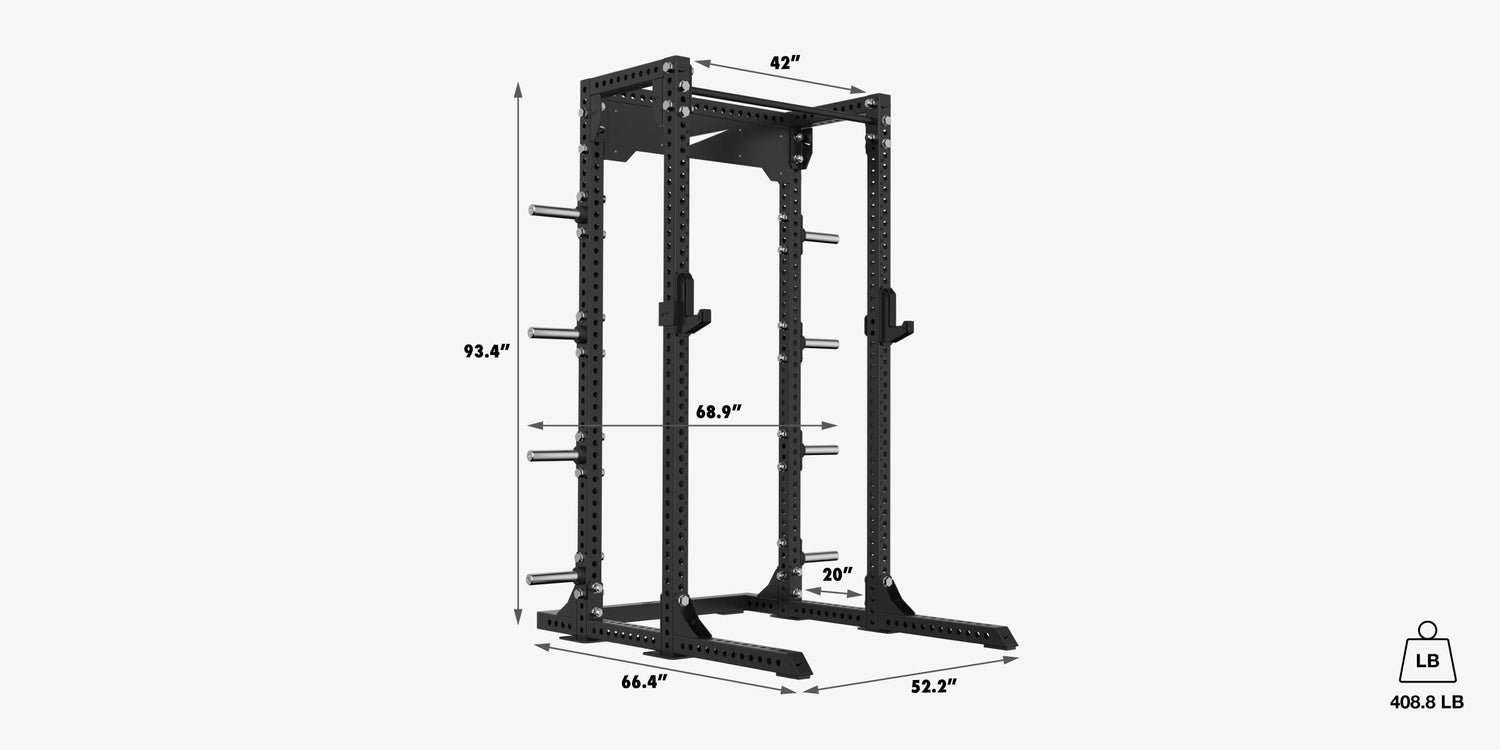 Constructed from true 3x3 11-gauge steel, the rack features industry-standard 1-inch laser-cut holes spaced 2 inches on center for broad attachment compatibility. Four-way offset uprights allow flexible configurations, while integrated weight storage keeps training floors organized and efficient. Upgraded UHMW-lined J-cups protect barbells under heavy use, and stainless-steel weight horn sleeves resist wear from repeated plate loading.